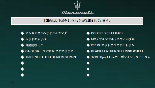 ※お客様がこれらの情報の中から、特定の車両の購入決定をする際には、それらにつきまして事前にマセラティ 紀尾井町・目黒・杉並 いずれかのショールームにてご確認頂きますようお願い致します。