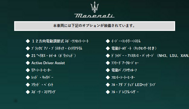 ※お客様がこれらの情報の中から、特定の車両の購入決定をする際には、それらにつきまして事前にマセラティ 紀尾井町・目黒・杉並 いずれかのショールームにてご確認頂きますようお願い致します。